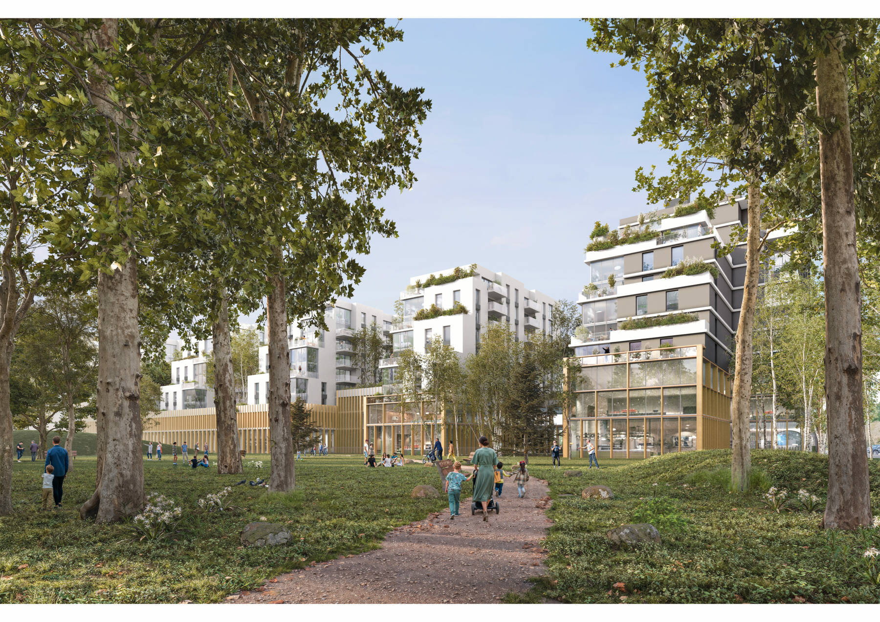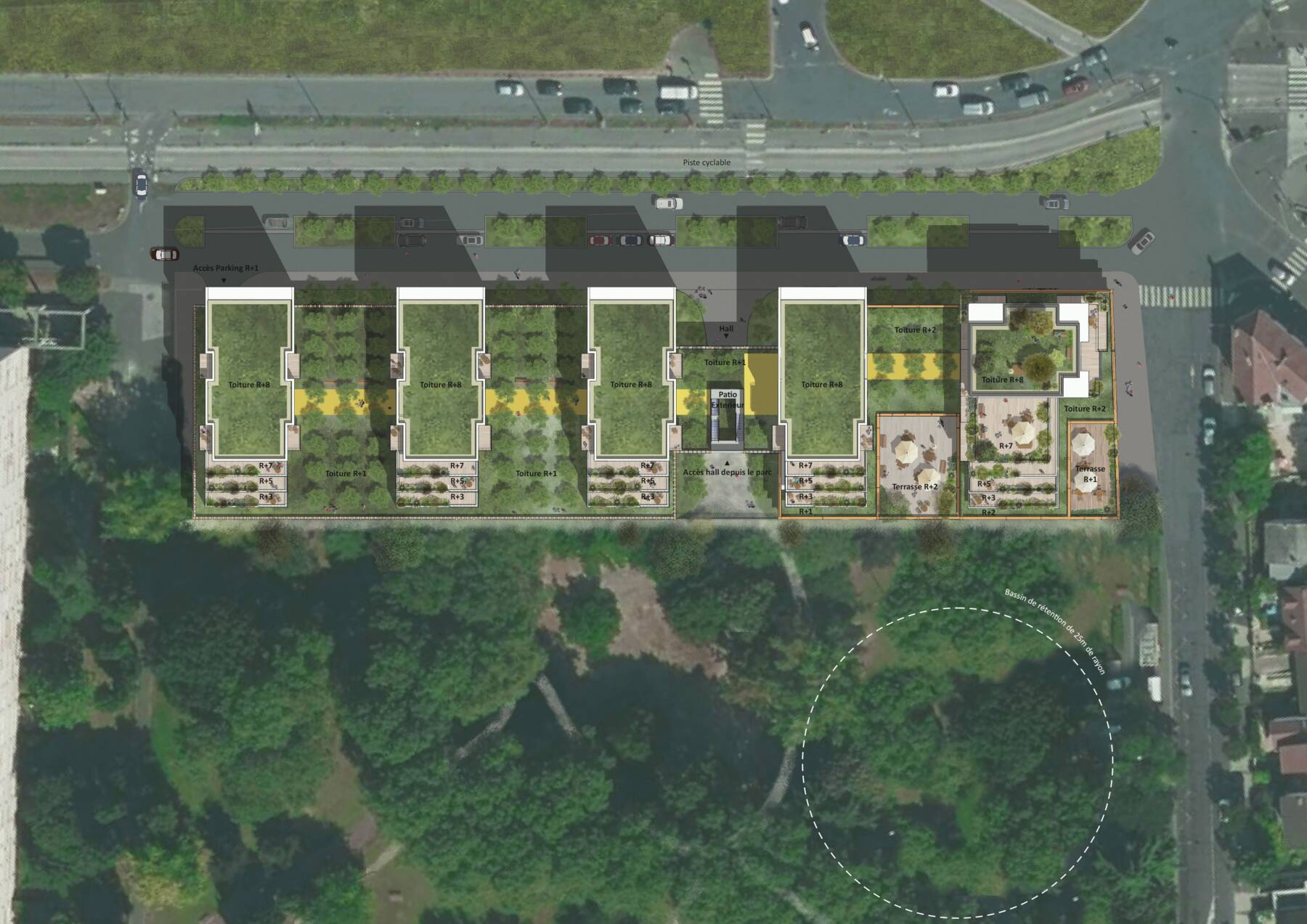 Ce site constitue une des entrée de ville de Fresnes depuis l’A86 et revêt donc un enjeu urbain important. Historiquement il a été le témoin de la seule opération d’auto-construction par ses futurs habitants (surnommés les Castors) d’une cité HLM, La Peupleraie, dans les années 60. Le terrain est bordé à l’arrière par un parc abritant des arbres centenaires, relais d’un réseau d’espaces verts fresnois riches en biodiversité. Le projet s’inscrit dans cette dynamique en recréant sur le toit du socle actif du RDC et R+1 des «forêts urbaines». Les immeubles de logements s’implantent «en peigne» pour se protéger des nuisances de l’autoroute et décliner côté parc de belles terrasses plantées. L’accès à la dalle plantée du 2ème étage se fait par un hall commun double-hauteur et traversant laissant voir le parc depuis la rue.