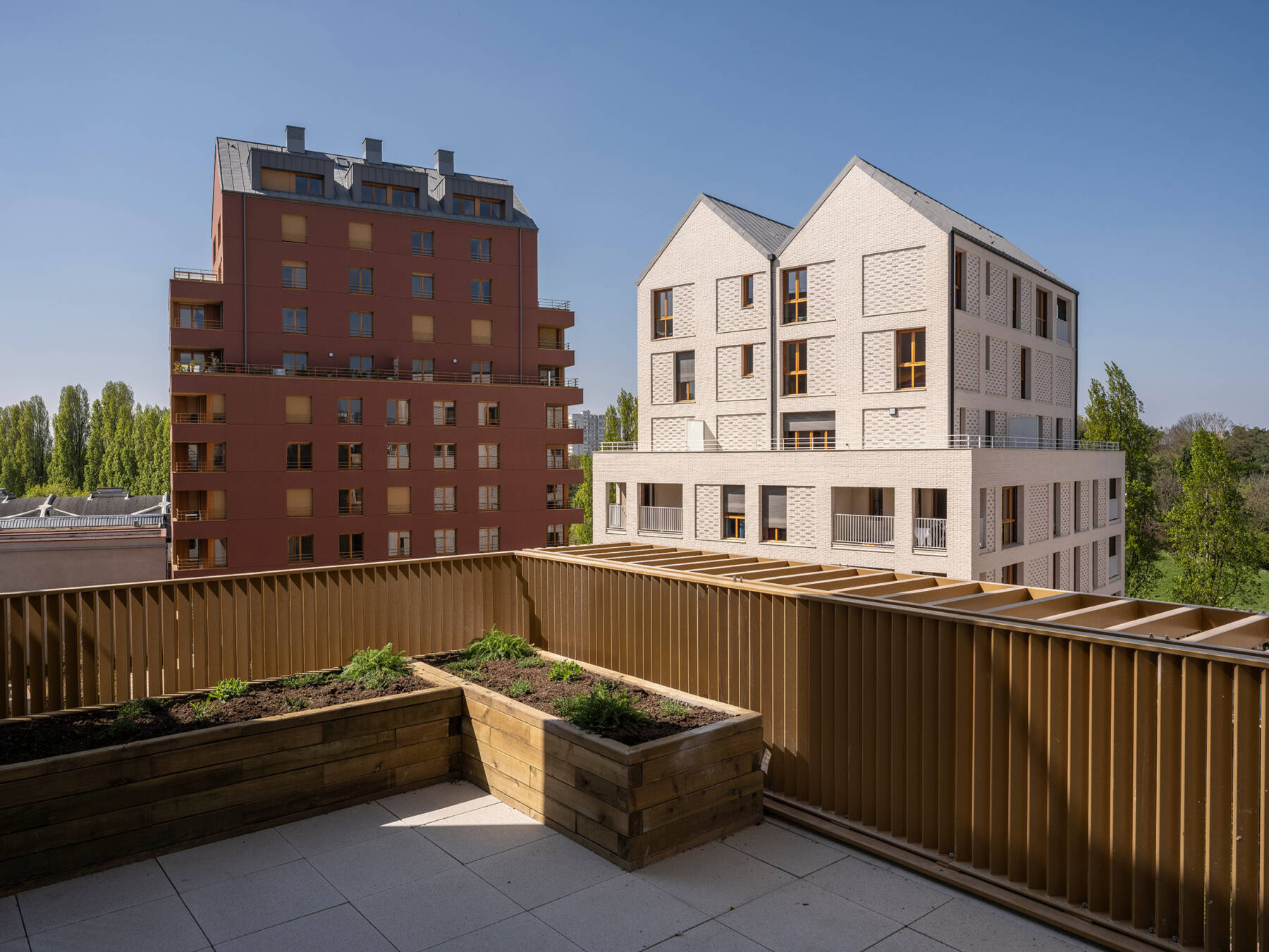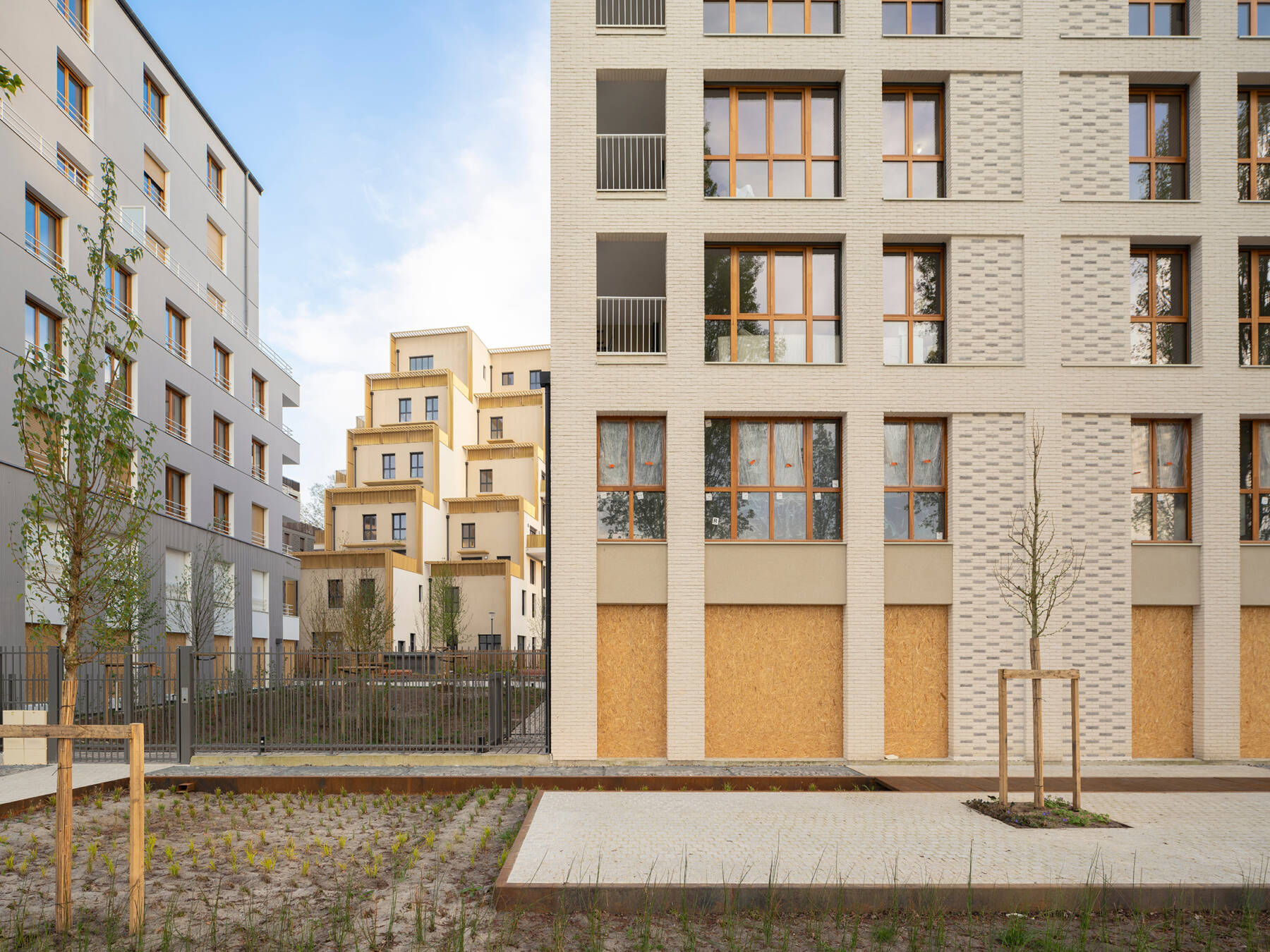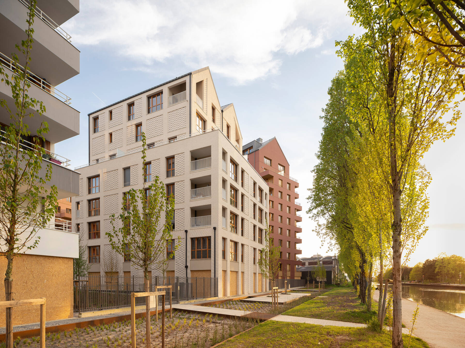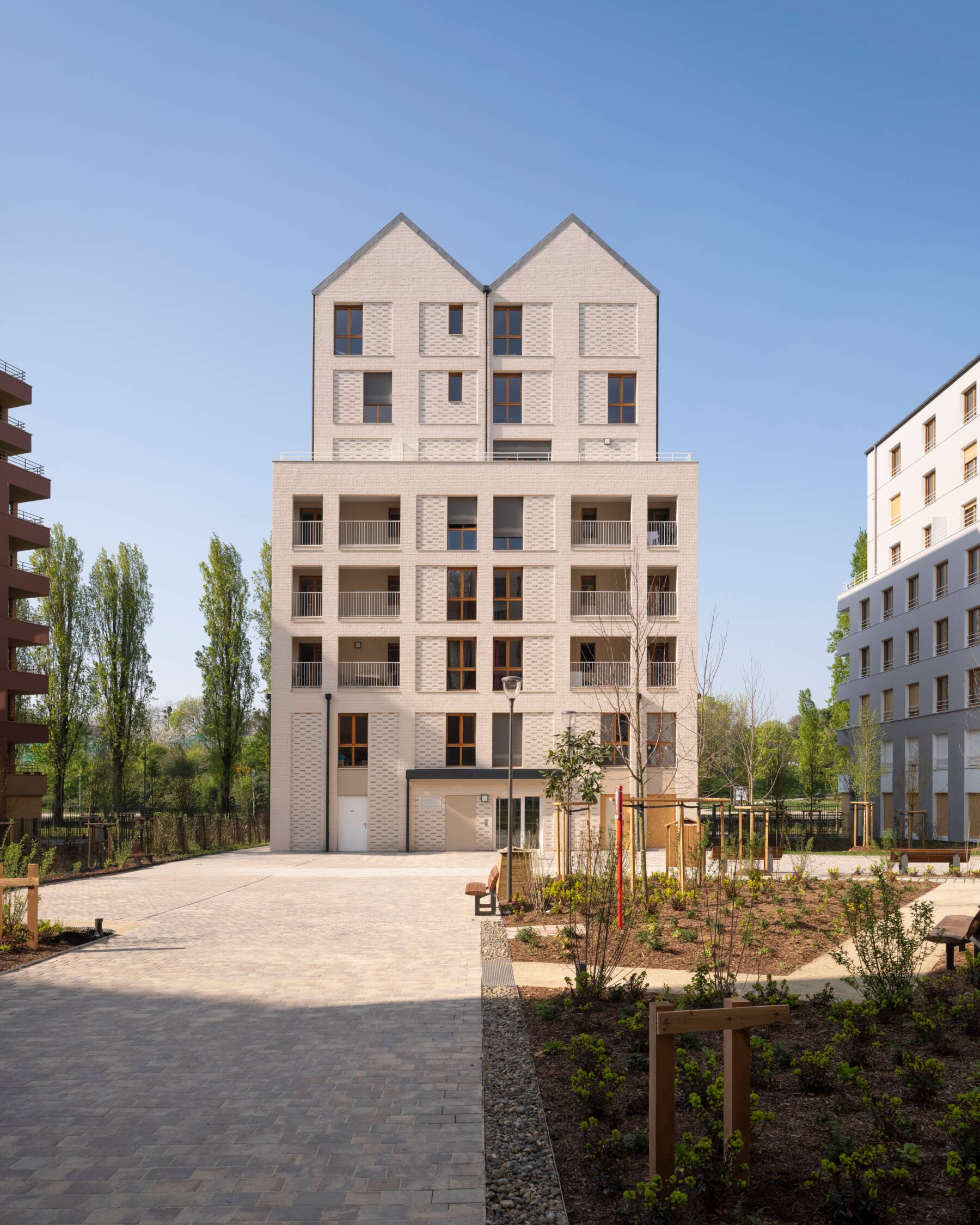 Label BiodivercitySur cet ancien site industriel situé le long du canal de L’Ourcq, le projet initié dans son Plan Masse par l’agence ANMA s’inscrit à la fois dans une modernité bienveillante tout en respectant l’histoire du lieu. A l’image des anciens ateliers du quartier, les façades sont recouvertes de briques tramées et offrent des ouvertures généreuses sur le canal. Tels les anciens entrepôts industriels, les toitures en pente rappellent des sheds. Les bâtiments aux gabarits R+9 sur rue, redescendent en douceur vers le jardin en cœur d’îlot, proposant une cascade de terrasses plantées panoramiques offrant des vues exceptionnelles sur le canal. Ce projet est réalisé en collaboration avec l’agence Pascal Gontier.