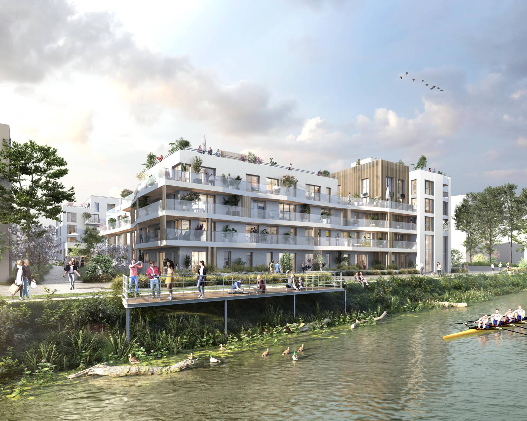 Le projet du Lot C, situé entre la place d’eau et le nouveau port (deux polarités principales de la Zac) prévoit la création de 83 logements, répartis sur 4 bâtiments, à l’intérieur d’un ilot ouvert sur les venelles piétonnes qui relient la voie haute et les bords de l’Oise. L’enjeu principal du projet est d’intégrer le parking en rdc tout en créant un front urbain qualitatif sur les bords de l’Oise et sur les venelles. L’intégration d’espaces extérieurs paysagés et généreux pour les logements des rdc et des étages offre une qualité de vie en échos à la douceur des paysages de « bords d’eau ».