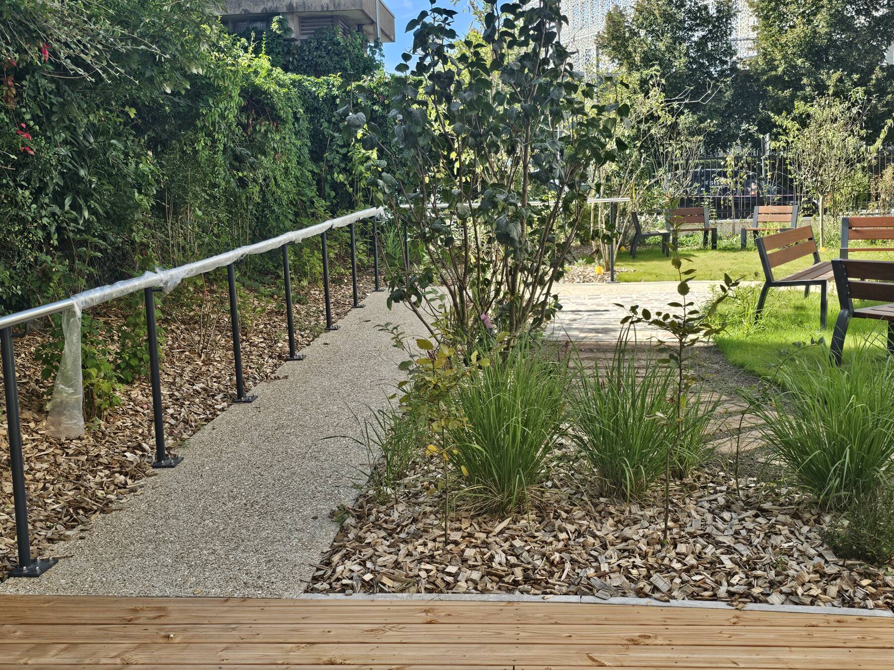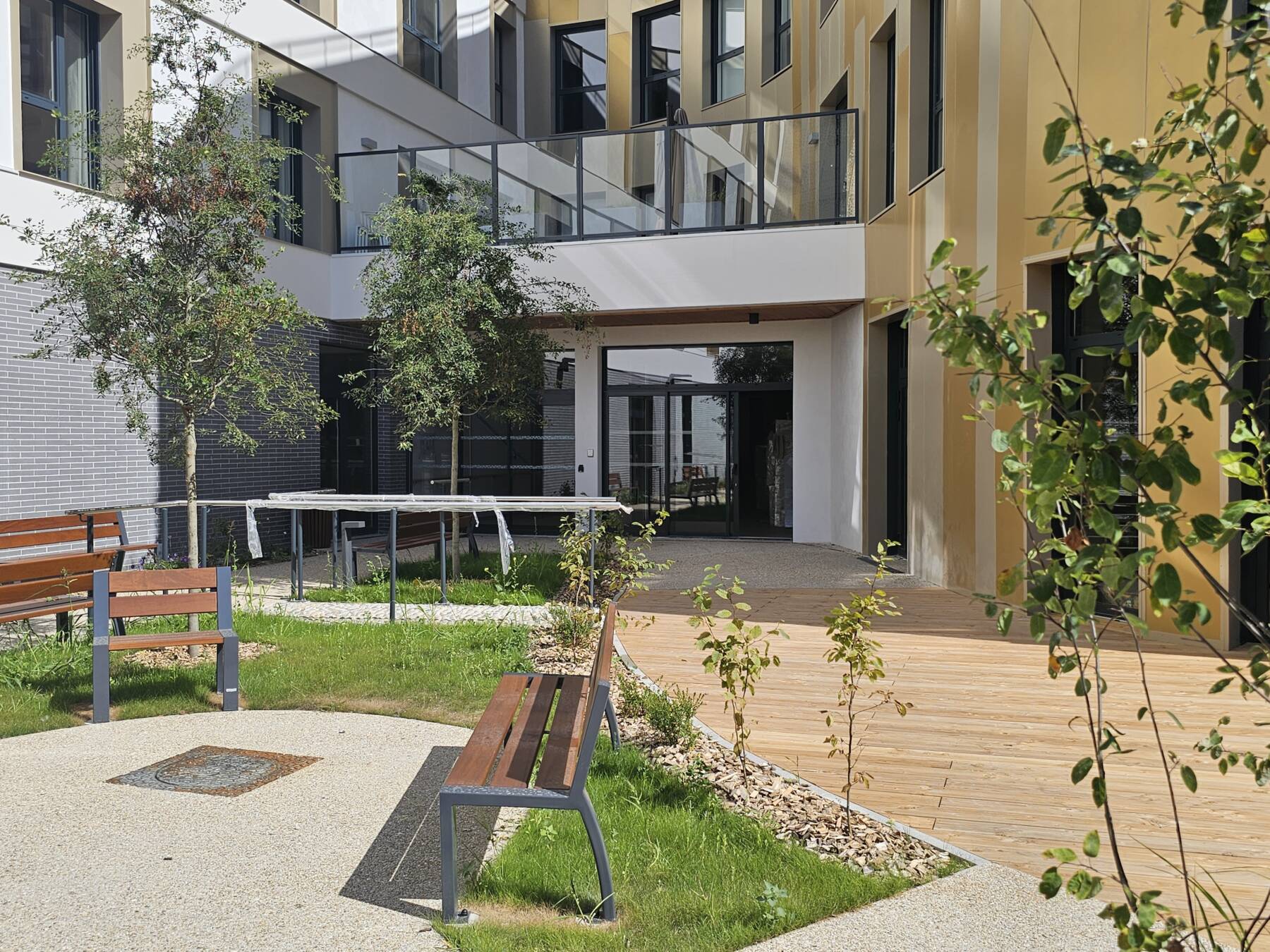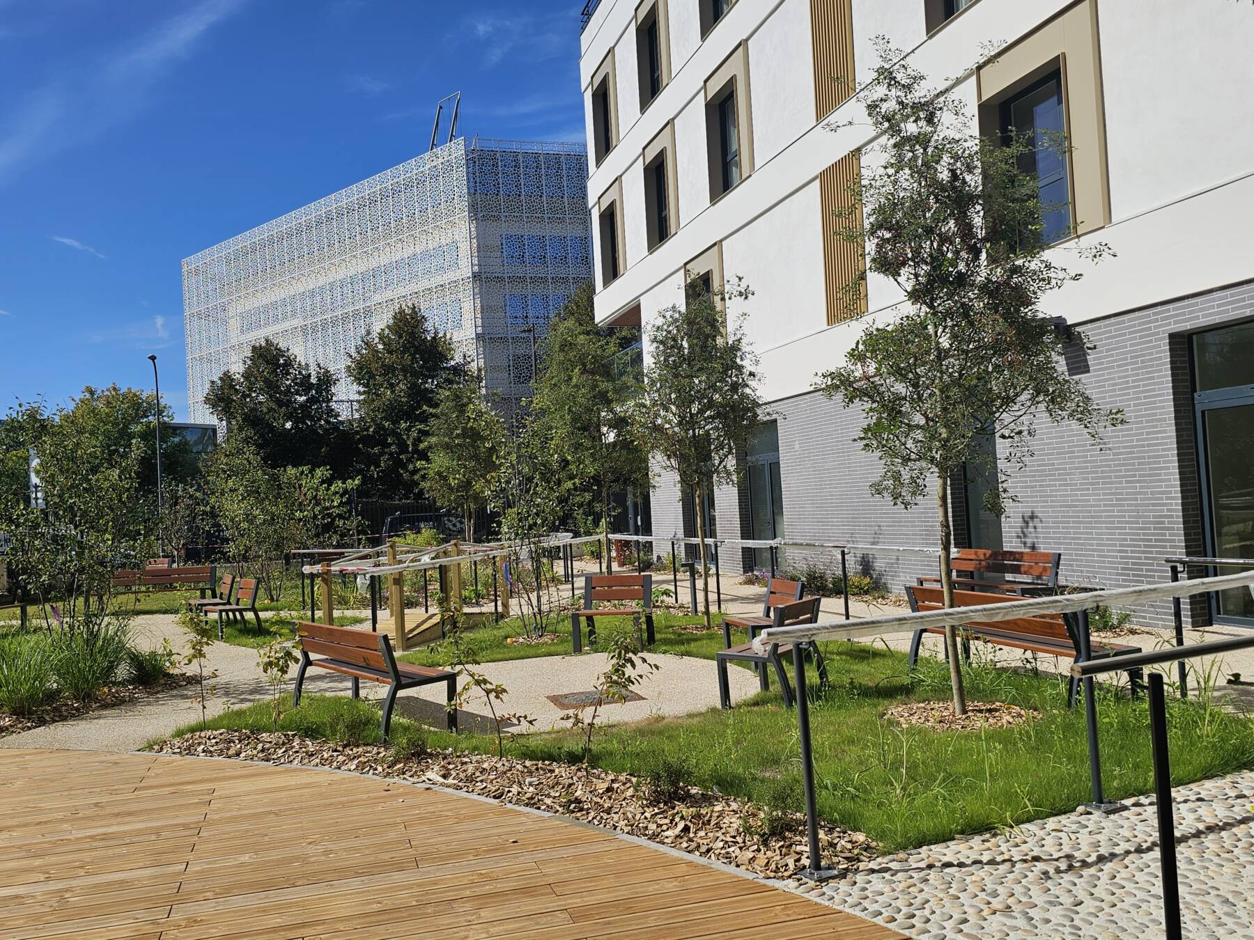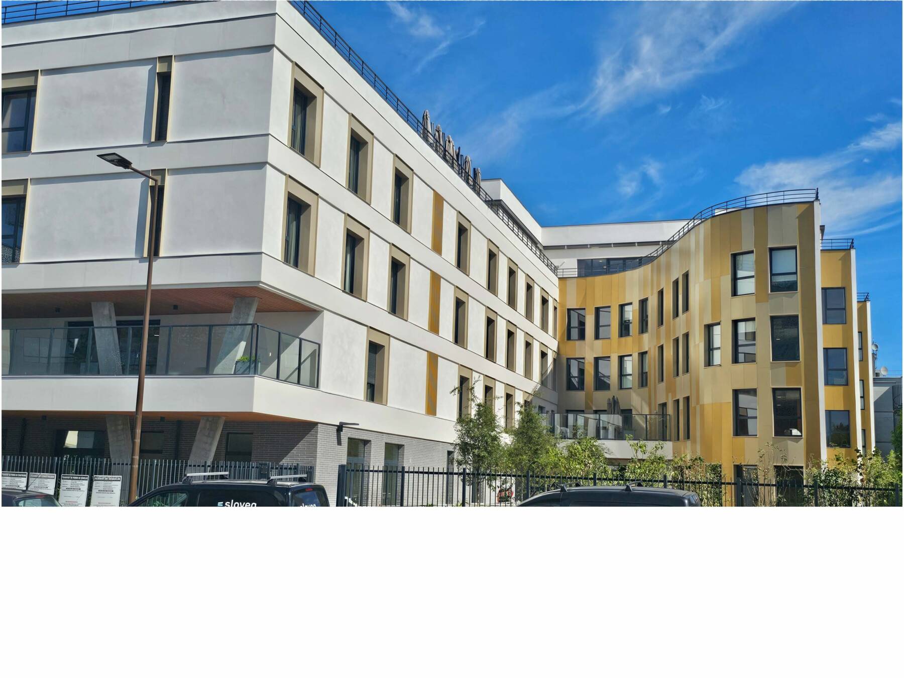 Le bâtiment, hébergeant un EHPAD ainsi qu’un restaurant indépendant, s’organise en « L », permettant de libérer une zone de jardin au sud de la parcelle et dégageant un maximum de linéaire de façade pour éclairer les chambres et les espaces de vie de l’établissement. La partie du bâtiment en courbe accueille les espaces de vie commune et s’ouvre largement sur le jardin à travers de généreuses baies vitrées. Le dernier niveau est traité en attique et offre deux vastes terrasses dont une permettra la mise en place de jardins potagers.