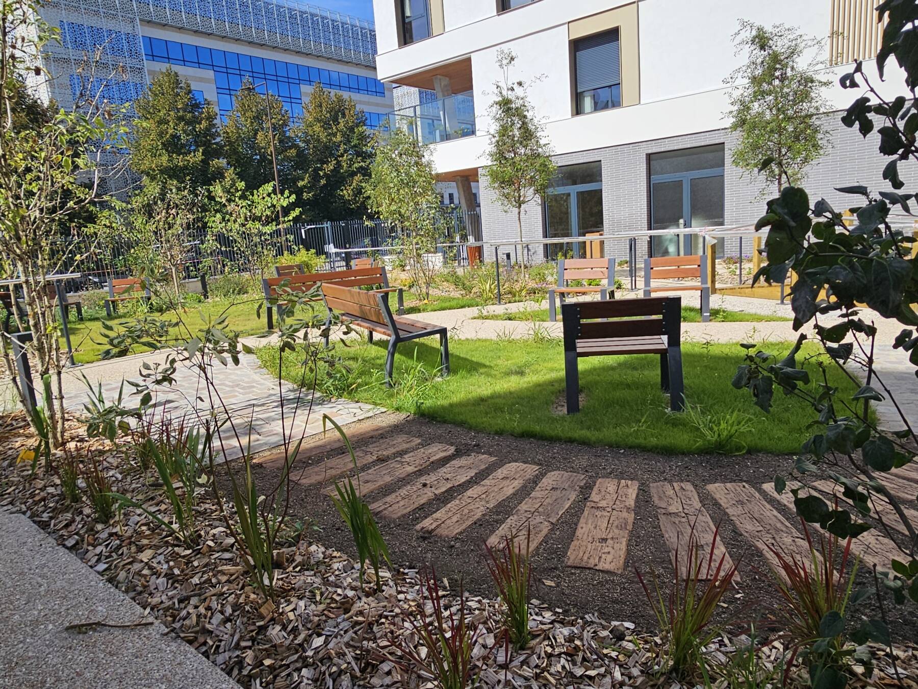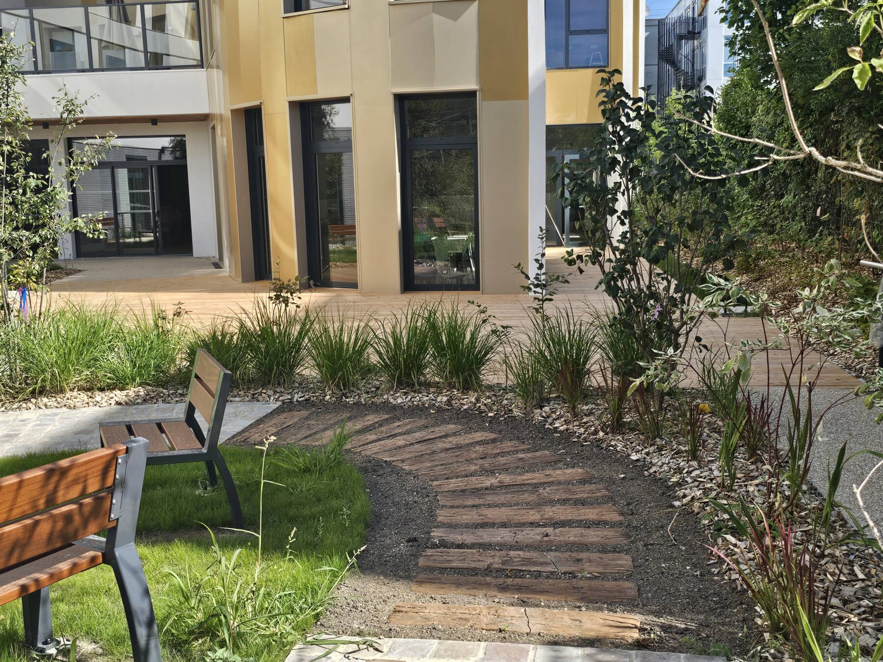 Le traitement architectural du bâtiment se différencie par une aile principale accueillant les chambres, et la partie courbe destinée à la restauration et aux activités. Cette dernière est traitée prend un aspect de petit équipement à part entière, alors que l’écriture de « l’aile-chambres » retrouve un traitement proche des bâtiments d’habitation. La partie en courbe du bâtiment au fond du jardin amène les résidents et les visiteurs vers l’entrée du bâtiment. C’est dans cette aile que le rez de chaussée accueille la salle de restaurant indépendant, ouverte sur le jardin, la rue et le quartier.